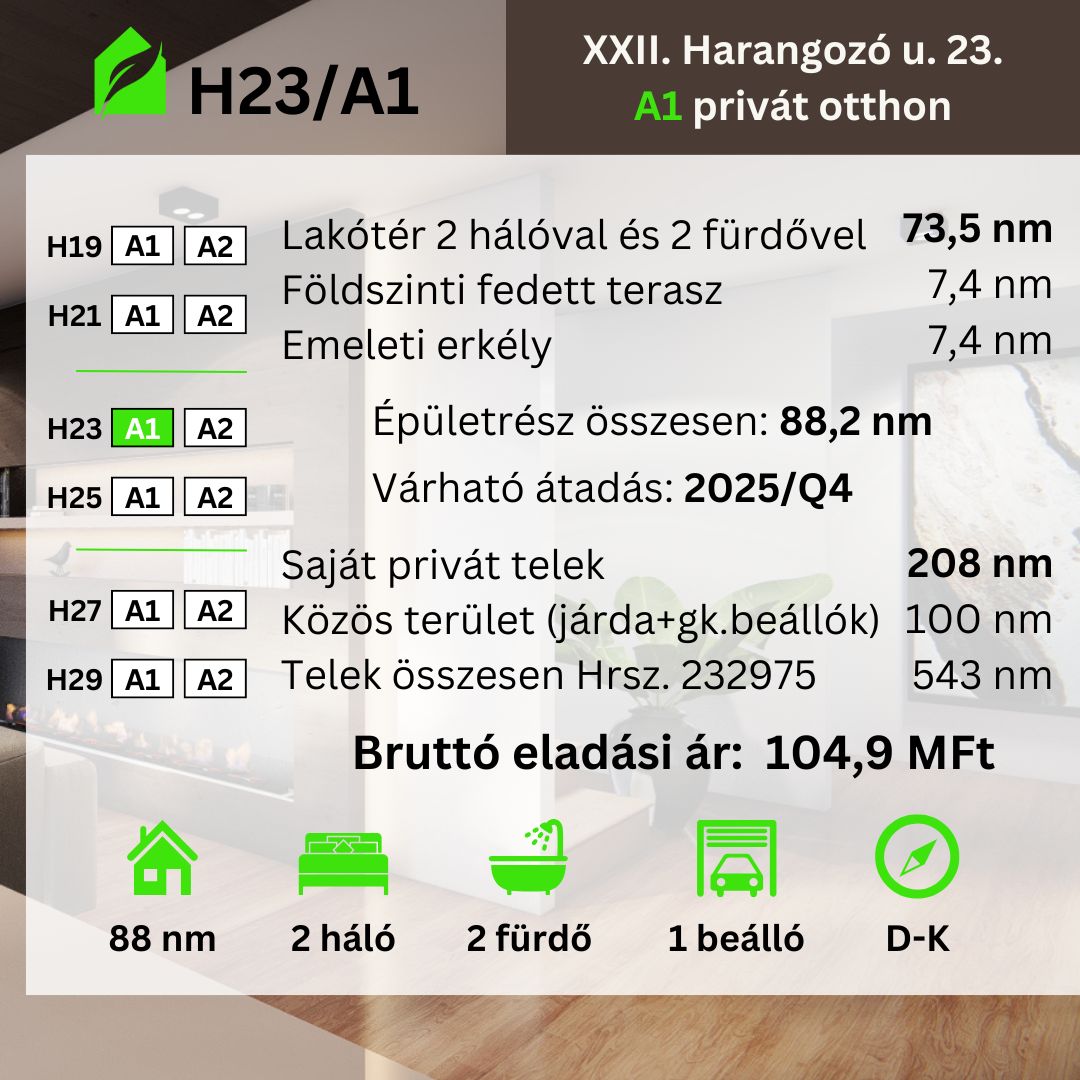 A jó térszervezésű, tájolású és magas felszereltségű, modern megjelenésű lakásokhoz emeleti erkélyek, földszinti fedett teraszok, illetve saját használatú privát kertek is kapcsolódnak, a közös területen pedig lakásonként 1-1 gépkocsibeálló biztosított. XXII. Harangozó utca 19 - 29. Hrsz. 232971 - 232981